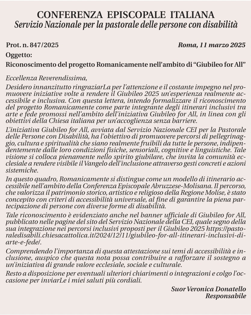Il riconoscimento di Romanic@mente  in  cammino negli itinerari del Giubileo For All rappresenta la concretizzazione di un impegno per le comunità. L’itinerario, che andrà oltre il Giubileo, come scrive Suor Veronica Donatello, responsabile della Pastorale delle persone con disabilità, ha l’obiettivo di promuovere percorsi di pellegrinaggio, cultura e spiritualità fruibili da tutte le persone. Un cammino di speranza che non esclude nessuno, ma mette tutti nella condizione umana e spirituale di godere della Bellezza donataci dal Signore.