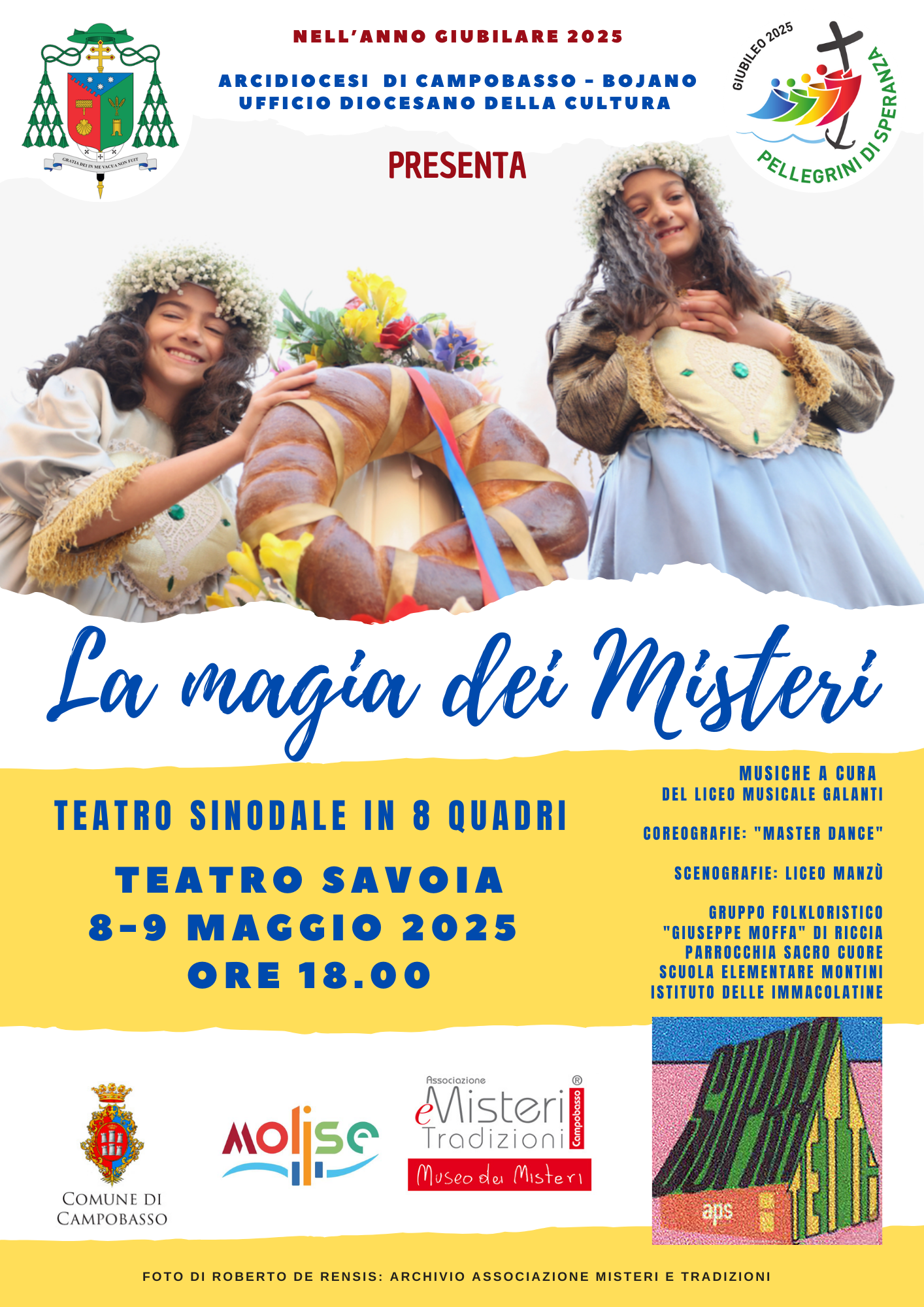 Per questo l’Ass. Sopraitetti aps, sotto l’egida dell’Arcidiocesi di Campobasso-Bojano, in collaborazione con altri Enti e Associazioni, Scuole e Parrocchie della città, ha allestito il Musical: “La Magia dei Misteri” SPETTACOLO IN 8 QUADRI al Teatro Savoia8-9 maggio 2025