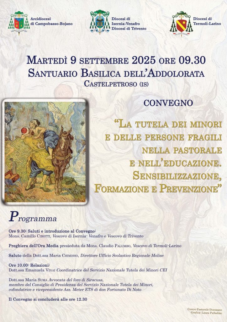 Lo scorso 9 settembre 2025 si sono incontrati nella cornice suggestiva della basilica dell’Addolorata di Castelpetroso (IS) diversi presbiteri, religiosi e religiose e molti docenti di religione cattolica delle quattro diocesi molisane, convocati dai rispettivi Vescovi per un primo convegno formativo nell’ambito della tutela dei minori e delle persone fragili, dal titolo: “La tutela dei minori e delle persone fragili nella pastorale e nell’educazione. Sensibilizzazione, formazione e prevenzione”. Il convegno è stato preparato in collaborazione con il Servizio Nazionale per la Tutela dei Minori (SNTM) della Cei con la presenza della Dott.ssa Emanuela Vinai, coordinatrice del SNTM che ha tenuto la prima relazione e dell’Avv. Maria Suma, membro del SNTM che ha tenuto, in collegamento online, la seconda relazione. Dopo il saluto iniziale di Mons. Camillo Cibotti, Vescovo di Isernia-Venafro e di Trivento e la presentazione dei saluti di Mons. Biagio Colaianni, Arcivescovo di Campobasso-Bojano, assente per un impegno a Roma presso la Santa Sede, Mons. Claudio Palumbo, Vescovo di Termoli-Larino ha presieduto l’Ora Media a cui è seguito un saluto della Dott.ssa Maria Chimisso, Direttrice dell’Ufficio Scolastico Regionale del Molise.