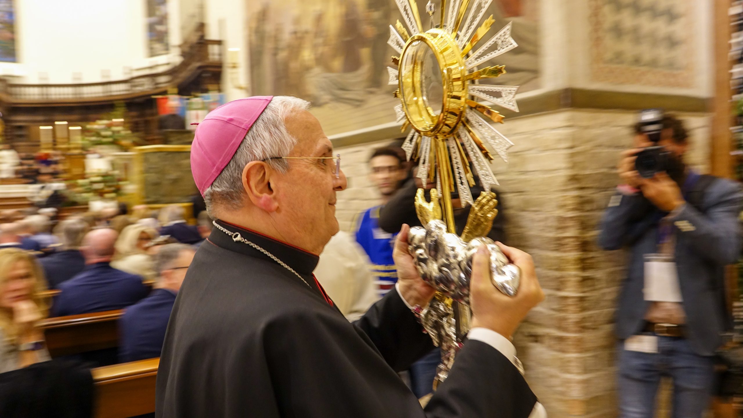 In particolare l’ostensorio è stato realizzato da Luca Ferrari, maestro orafo di Guardiagrele. Tale opera richiama la forma dell’ostensorio del Miracolo Eucaristico di Lanciano e presenta due angeli in ottone che sorreggono lo stemma francescano cesellato. Al di sopra vi è la teca per l’esposizione del Santissimo Sacramento con raggi in argento realizzati con la tecnica della filigrana. L’ostensorio è sormontato  da una fedele riproduzione della croce processionaria di Nicola da Guardiagrele.  Ha consegnato il dono S.E. Mons. Camillo Cibotti, Presidente della Conferenza Episcopale Abruzzese-Molisana.