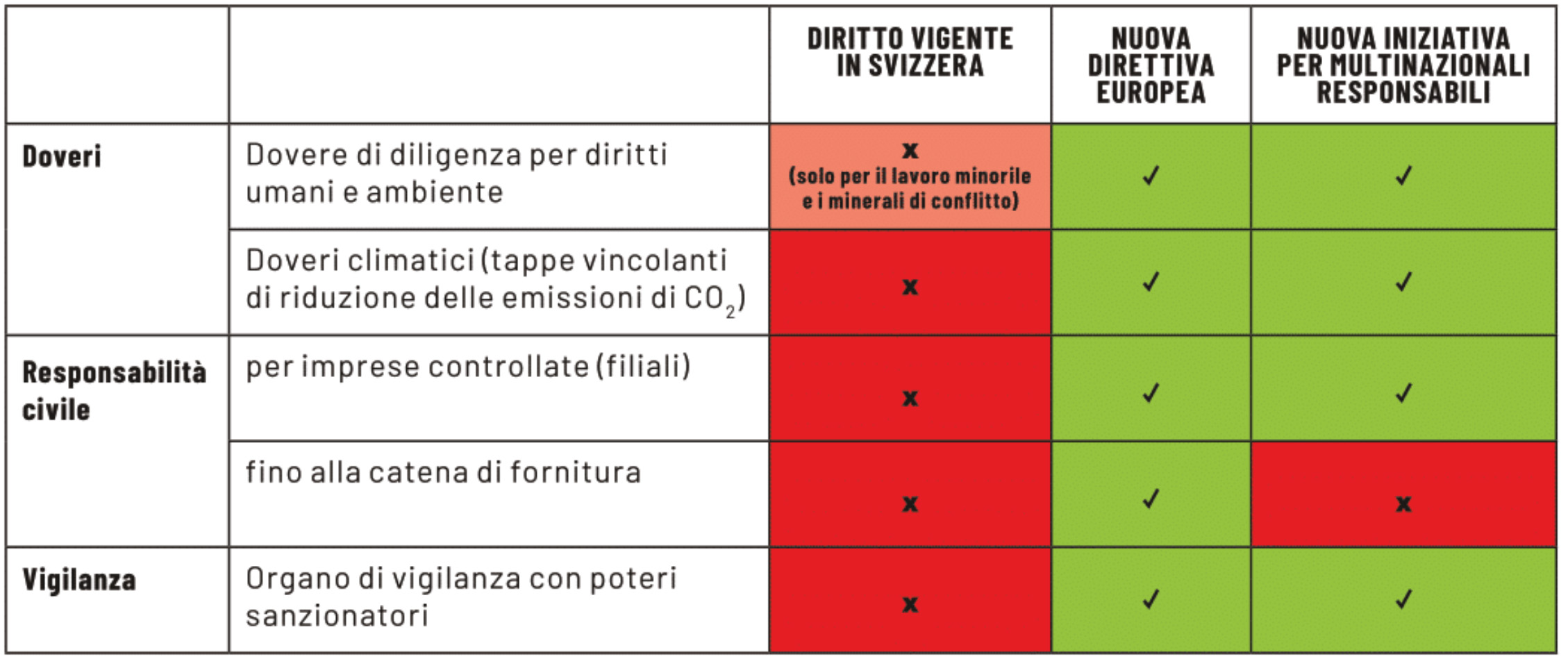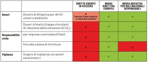 Ma le promesse sono rimaste tali nonostante, nel frattempo, Paesi importanti come la Germania e la Norvegia abbiano introdotto leggi sulla responsabilità d’impresa e l’Unione Europea abbia adottato una impegnativa Direttiva nella primavera del 2024. La tabella riportata in seguito, che confronta la normativa Svizzera con quella dell’Unione europea, è illuminante più di tante parole al riguardo.