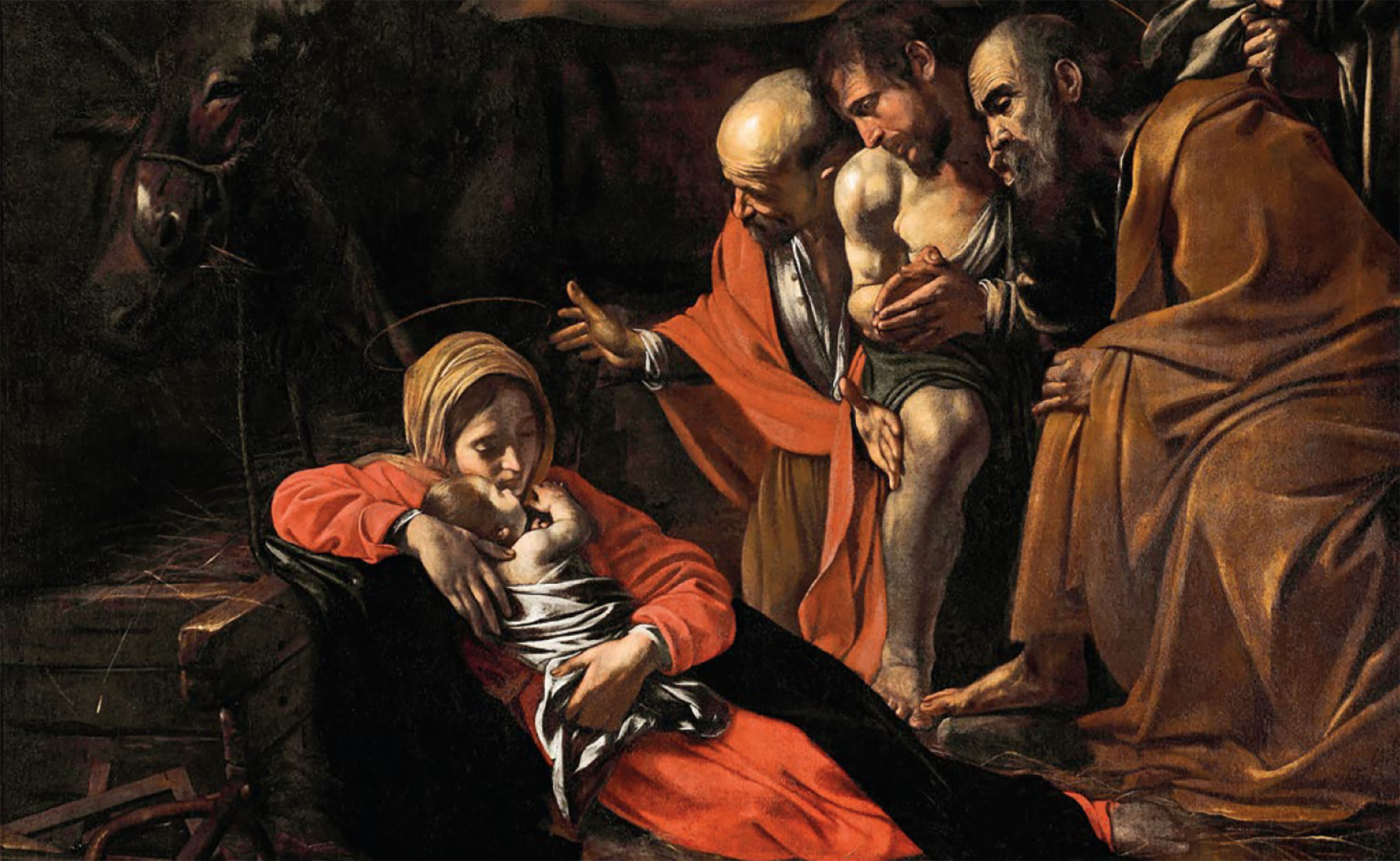 I pennelli che hanno saputo incidere sapientemente il sacramento di questo Principio sono quelli di Caravaggio, nella tela raffigurante l’Adorazione dei pastori (1609). Una preziosa pala d’altare, attualmente custodita presso il Museo Regionale di Messina. Caravaggio è il pittore, che più di tutti, ha saputo condensare l’avvento definitivo della Rivelazione e tratteggiare con alto realismo l’epifania degli estremi. In quest’opera il Merisi ci fa dono di un’apoteosi mistica, dove la condizione terrena è resa capace di una vera fusione con la Grazia. Lo sguardo è spinto senza sforzo proprio lì dove non c’è una culla, dove non ci sono coperte. Il vuoto della stalla accentua però solennemente il consegnarsi dall’alto della Luce del Verbo. Ed ecco, c’è Maria che si fa altare per il suo Gesù. La tenera Madre, è adagiata per terra, come segno della sua totale umiltà davanti all’Altissimo. Con una mano lo accarezza e con l’altra lo protegge.  A destra c’è lo sguardo dei pastori che si fa sintesi di adorazione e di estasi: le creature che ritrovano il Creatore.
