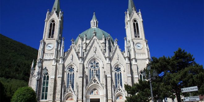 Progettato in stile neogotico da Francesco Gualandi di Bologna, il Santuario è un inno a Maria e al Molise. Interamente scolpito in pietra locale, la prima pietra viene posata il 22 settembre 1890 e la consacrazione avviene il 21 settembre del 1975. una gestazione lunga e difficile! Il Santuario sorge a pochi metri dall’antico tratturo percorso da pastori e pellegrini incastonato tra il verde dei boschi. Salendo fino alla cappella delle apparizioni si nota il significato progettuale, teso ad esaltare la sofferenza “offerente” di Maria. La pianta del tempio simboleggia un cuore trafitto da sette spade. Colpisce il visitatore il percorso che conduce al Santuario. Lungo il viale, in un cammino di riflessione due suggestivi angeli, Michele e Gabriele, sono posti al limite del parcheggio e ricordano l’attegiamento in cui deve porsi il pellegrino. Una gigantesca pietra richiama al paganesimo e al senso del sacrificio incarnatosi poi in Cristo, per portare a compimento la rivelazione. In alto spiccano tra croci, a significare la salvezza che passa attraverso la sofferenza, annunciata con le parole di Paolo all’Aeropago, che si leggono in una stele. Incontriamo poi, sul piazzale antistante, un altare, di 80 quintali in cui Giovanni Paolo II in visita al Santuario celebrò l’eucarestia il 19 marzo 1995 e dietro un bronzo raffigurante l’Assunta, dono del 50° anniversario di Sacerdozio di Mons. Ettore Di Filippo, Vescovo emerito di Campobasso-Bojano. Che tanto ha contribuito alla diffusione del messaggio mariano. Così corroborati da tanta teologia si può contemplare l’esterno del Santuario.